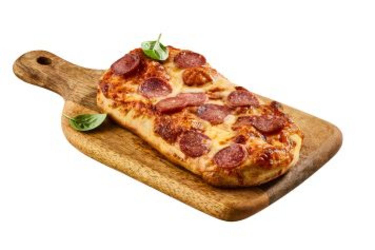 - Pinsapohjan päällä maukasta tomaattikastiketta, mozzarellaa sekä kalkkuna-naudanlihasalamia.